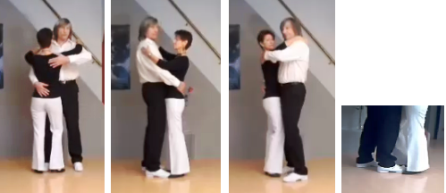 Füße stehen parallel zum Partner und sind nicht geschlossen. Jeweils der rechte Fuß zeigt zwischen die Füße des Partners. Das Paar steht mit der rechten Körperhälfte voreinander (halb links versetzt) und baut mit der Körpermitte Kontakt zueinander auf. Wir stehen aufrecht, Schulter- und Hüftlinie verlaufen parallel, mit Führungskontakt über die Hüfte. Oberkörper, mit etwas Abstand zum Tanzpartner (Ypsilon-Haltung).