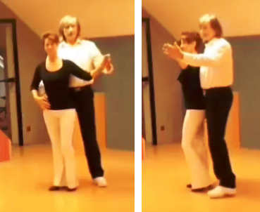 Ähnlich wie in der Standardtanzhaltung, nur etwas weiter nach vorne gehalten, bietet Er seine linke Hand an. Sie legt ihre linke Hand in seine offene Hand.