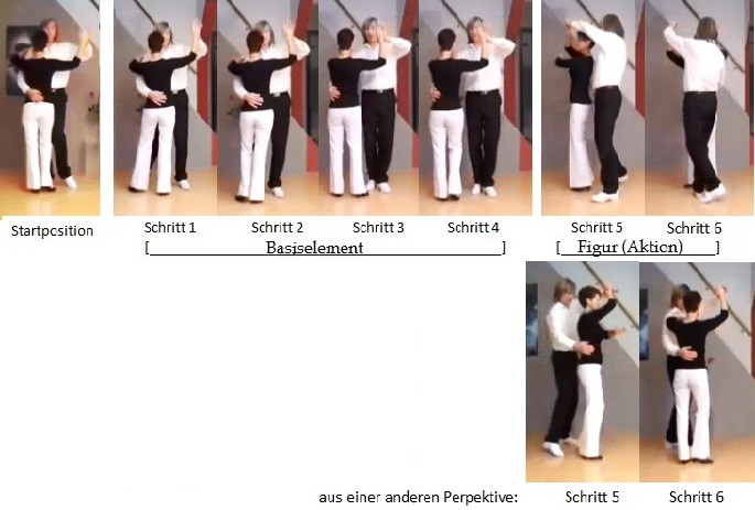 Besonderheit: Mit Schritt 3 tanzt der Herr nicht zur Seite, sonder nur eine Gewichtsübernahme am Platz, auf den rechten Fuß.