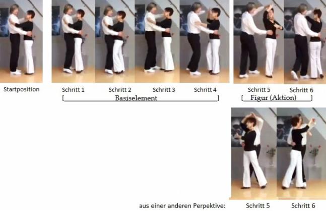 Führung: Der Herr führt die gefassten Hände mit Schritt 4 in die Paarmitte und mit Schritt 5 in Tanzrichtung der Dame.